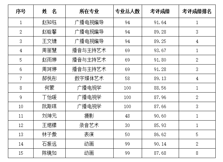 根据教育部推免工作视频会议工作部署及《教育部关于印发〈2025年全国硕士研究生招生工作管理规定〉的通知》(教学〔2024〕4号)、《教育部办公厅关于进一步规范和加强推荐优秀应届本科毕业生免试攻读研究生工作的通知》(教学厅〔2020〕12号)、《哈尔滨师范大学推荐和接收优秀应届本科毕业生免试攻读硕士学位研究生工作管理办法》(哈师大[2016]32号)及《关于做好2026年推荐和接收优秀应届本科生免试攻读硕士学位研究生工作的通知》的文件精神和要求,传媒学院于9月9日至9月12日开展了2026年推荐优秀应届本科生免试攻读硕士学位研究生工作。通过学生自愿申报,学院推免工作领导小组开展对各专业报名学生进行资格审查、材料审核、学习成绩排序及综合测评等审核工作,同时会同教务处、学生工作处进行确认。由于动画专业有2名申报学生符合推荐条件,学院领导小组按照学校文件要求,结合我院本科专业布局、国家级一流专业建设点(按批复时间顺序且在2025年名额分配情况基础上)合理分配名额,将1个名额调整给播音与主持艺术专业。具体拟推荐名单如下: